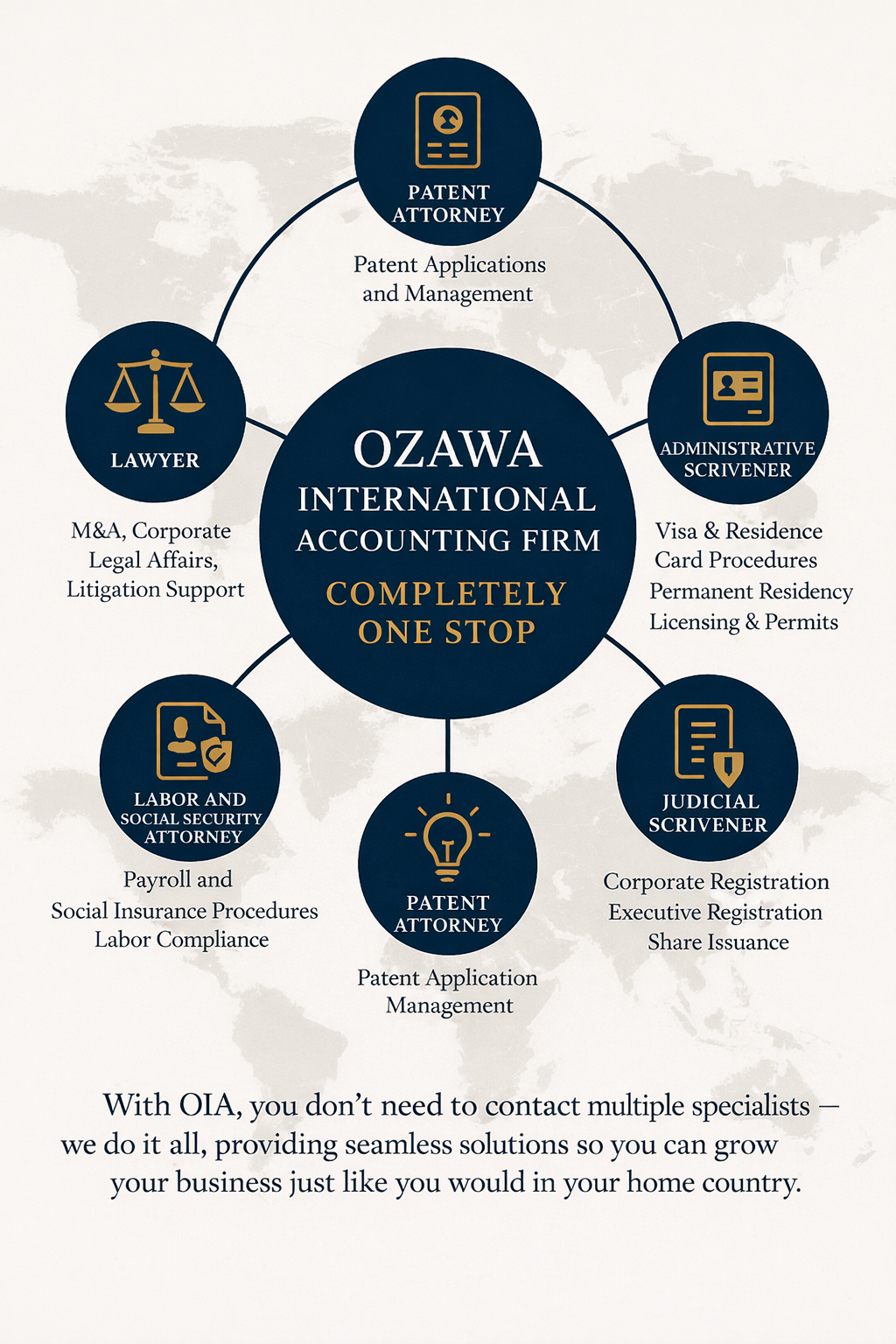 Japan’s regulatory, tax, and business environment can be complex for overseas companies. Ozawa International Accounting Firm (OIA) provides comprehensive, one-stop professional services for overseas businesses entering, operating, and expanding in Japan by integrating accounting, tax, legal coordination, finance, and cross-border advisory.